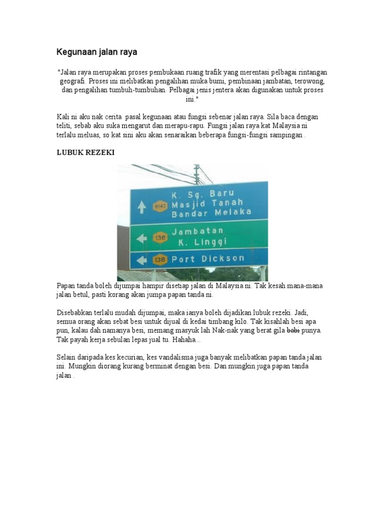 Papan Tanda Lalu Lintas Docx Document from reader021.docslide.net Jalan raya mempunyai peraturan yang tersendiri supaya semua pihak dapat menggunakan jalan raya dengan selesa, baik dan selamat. Kebanyakan papan tanda didapati diletak di belakang pokok yang besar, di kawasan yang terselindung dan pelbagai tempat yang tidak banyak membantu pengguna untuk membuat keputusan. Sebenarnya setiap perbezaan papan tanda itu ada maksud tersendiri yang dicipta untuk memudahkan pemanduan kita sebagai pengguna jalan raya. Memastikan keselamatan diri dan pengguna lain. Kepentingan mematuhi papan tanda jalan raya. Masa depan dan cabaran bm. Tentu saja untuk melindungi tubuh dari panas dan dingin. Papan tanda ini dapat mengelakkan kenderaan daripada mengalami kerosakan kerana melalui jalan yang tidak rata.